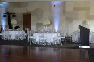For larger weddings, the Grand Event Room at White Oaks Resort offers a modern and dreamlike ambiance, the space spans an impressive 6,000 square feet that can hold up to 430 guests. The Grand Event Room at White Oaks Resort features a design that incorporates natural colors, providing a gorgeous canvas for your wedding decorations and ideas. The Garden view Foyer and patio, which are adjacent to the Grand Event Room, boast floor-to-ceiling windows that flood the area with natural light and offer easy access to the beautifully landscaped gardens.
